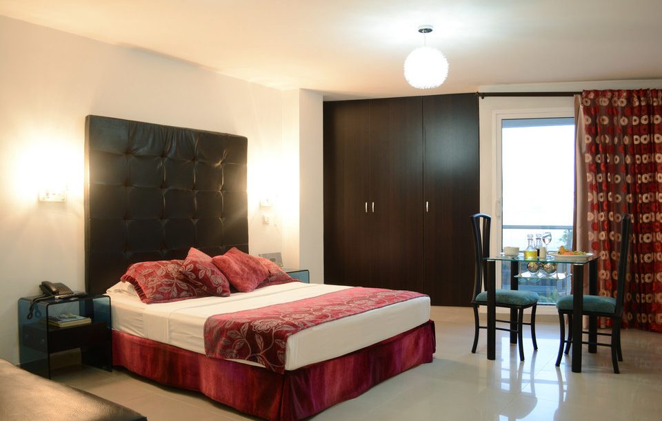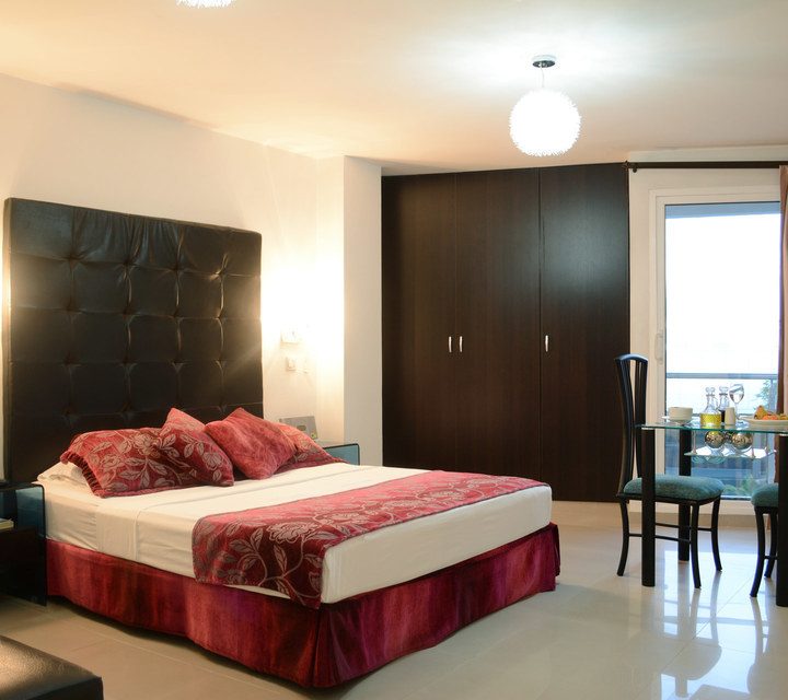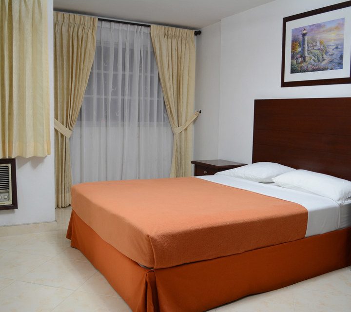 Habitación con una cama de 2.0 por 2.0. Equipada con aire acondicionado, dos televisores, baño privado, closet amplio, nevera y caja de seguridad y comedor.